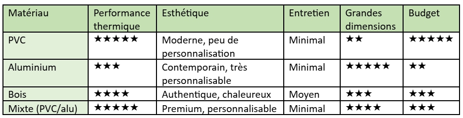 Le choix du matériau de votre fenêtre influence directement la performance thermique, mais aussi la durabilité, l’esthétique et la facilité d’entretien de la menuiserie.