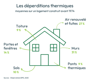 Selon les derniers chiffres de l’Observatoire du DPE, les déperditions de chaleur d’une maison se concentrent dans des zones clés :